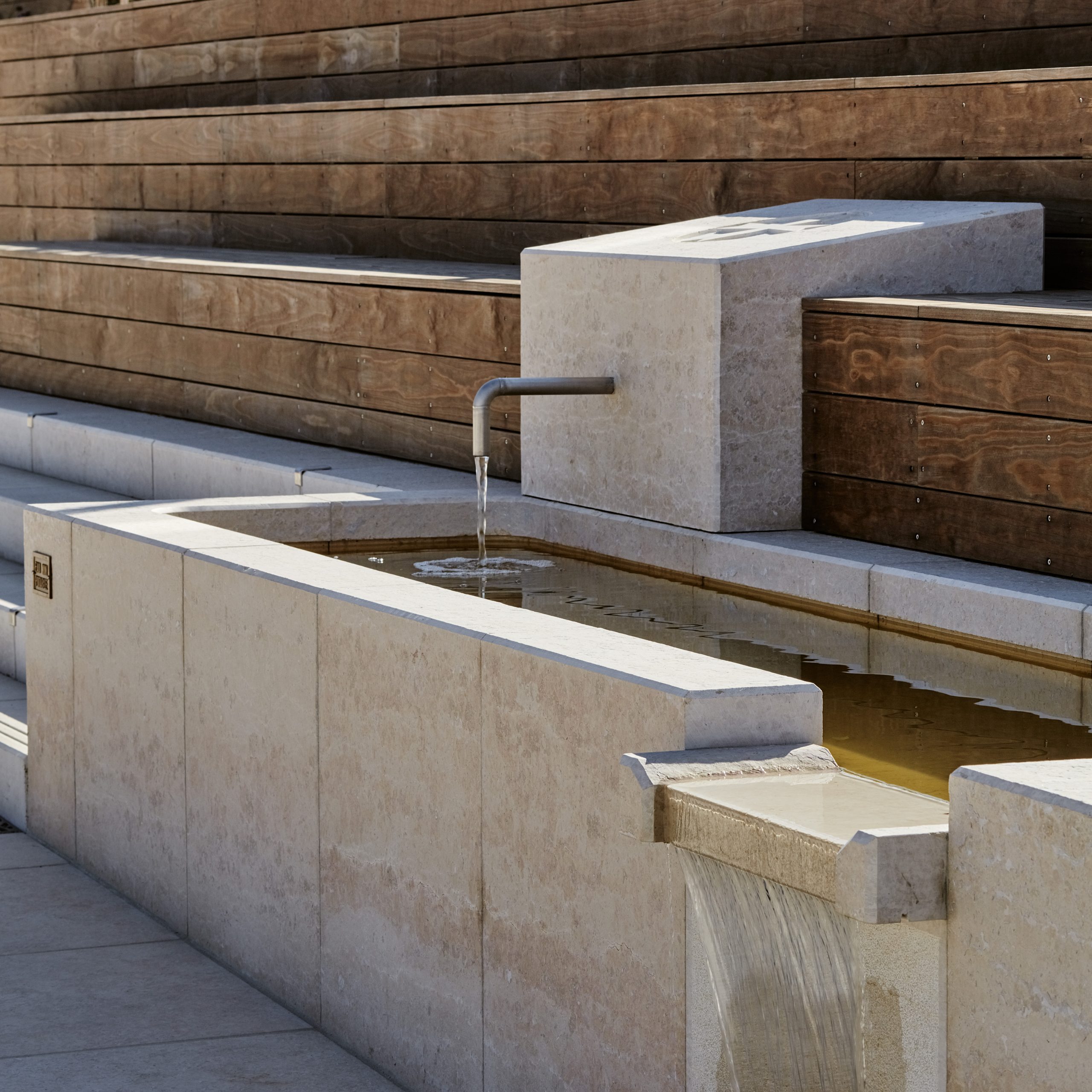 __  Des emmarchements multifonctions comme liaison entre le mail haut et la place centrale. Ils proposent des assises bois dessinées sur mesure, intégrées aux escaliers et créant de larges banquettes de repos ; une rampe intégrée aux emmarchements reliant la place haute et basse ; une fontaine avec un chemin d’eau jouant avec le relief et placé sur l’ancien tracé du talweg .