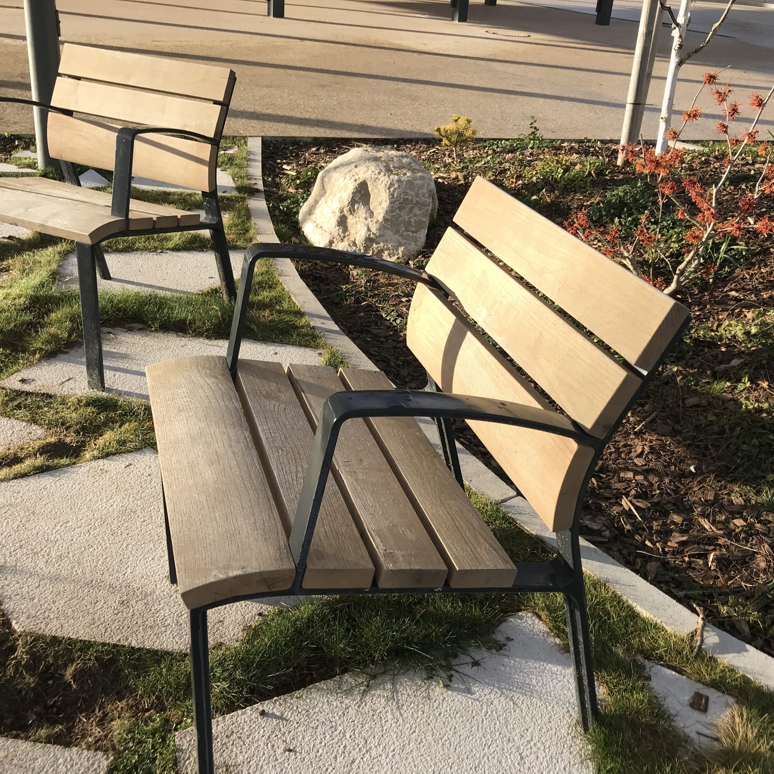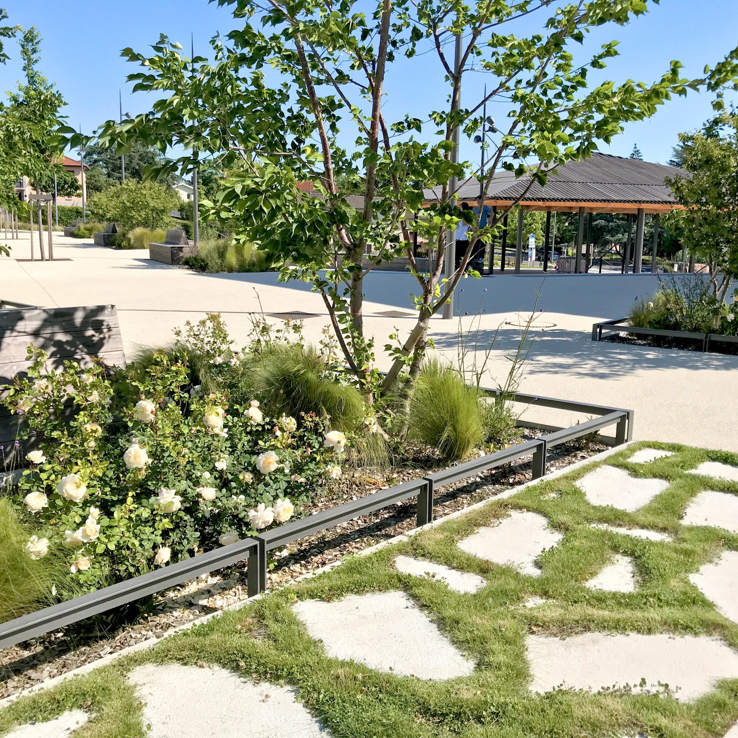 __ Des salon-jardins, perméables grâce à des dalle-pelouses en opus incertum, et alternés de butes, ils redonnent une continuité du relief amont. Ces salons constituent une franche épaisse au nord de la place donnant la possibilité d’une pause casse-croute, les pieds au sec mais dans un foisonnement végétal.